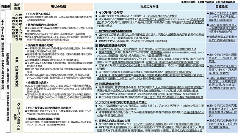 こうした状況のなか、今回のビジョンでは「インフレへの対応や魅力的な国内市場の創出」を取り組み指針の筆頭に掲げている。その一環として政府は昨年11月、事業実施の確実性を高めるため、①撤退や遅延を抑止する保証金制度の見直し、②収入・費用の変動などに伴うリスク分担のあり方の観点から価格調整スキームの導入、といった見直し案を示している。そのうえで公募の公平性を損なわないことを前提として、制度のあり方についてさらなる検討を行うほか、着床式の発電コストを35年までに8~9円/kWhとする産業界の目標を見直す方針だ。また浮体式についても、競争力がある強靱なサプライチェーンの構築に向けて、産業界において発電コスト目標の検討を開始するとしている。
