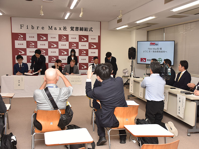 締結式は秋田県庁で行われ、秋田県の鈴木健太知事と秋田市の沼谷純市長、ファイバーマックスのDirector Renewable Energy サンダー・V・ファン・ヘルヴォルト氏、同社の日本におけるパートナーであるアイルエンジニアリング(本社:岡山県倉敷市)の玄馬淳社長、マツモト綱販(本社:大阪市)の松本健吾取締役、地元での調整役を担うウェンティ・ジャパン(本社:秋田市)の佐藤裕之社長が出席した。