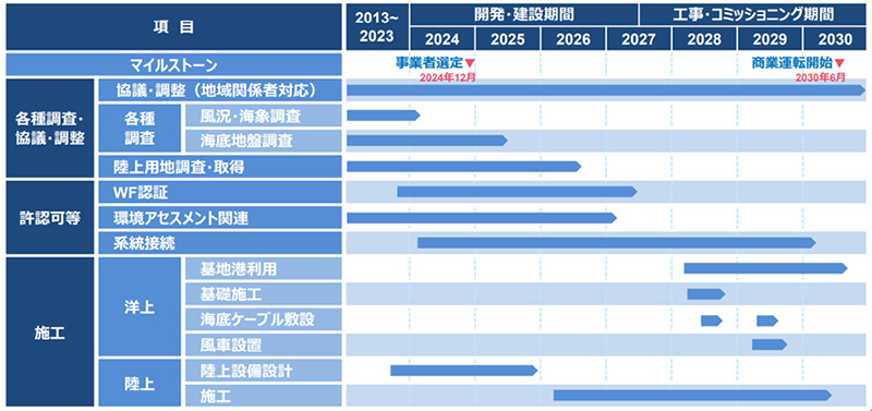 第5回法定協議会が10月28日、青森県つがる市の生涯学習交流センター松の館で開催された。会議では、選定事業者の「つがるオフショアエナジー共同体」が事業概要と今後の建設スケジュールを説明した。計画では、26年春に陸上工事に着手し、28年春から洋上工事に取りかかり、30年6月の運転開始を目指す。