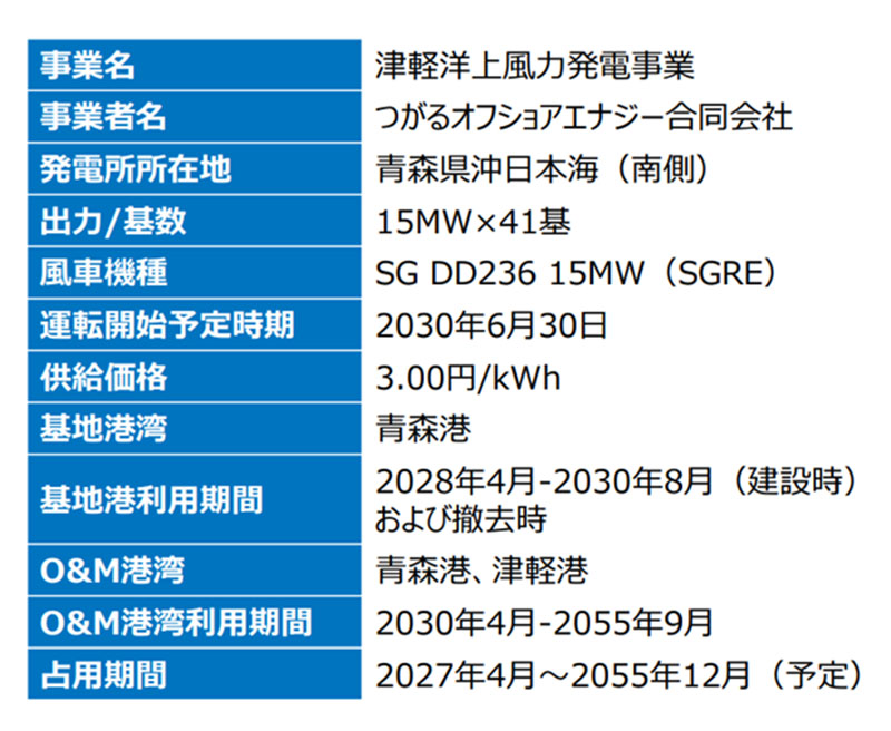 青森県日本海南側は2024年12月に、JERA、グリーンパワーインベストメント、東北電力の3社で構成する「つがるオフショアエナジー合同会社」が事業者に選定された。発電設備は着床式。発電出力は61万5000kW(1万5000kW×41基、Siemens Gamesa Renewable Energy製)。供給価格をゼロプレミアムである3円/kWh。