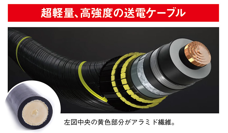 帝人のアラミド繊維は、浮体式送電ケーブルの補強材としても注目を集めている。同社は2025年3月、英国の強化プラスチック素材メーカーなどと新会社を設立し、アラミド繊維を用いたケーブル補強材の開発・製造に乗り出した。浮体式風車は波で常に揺れるため、鋼製の補強材だと金属疲労で破断するおそれがある。アラミド繊維は、振動に強く柔軟性があるため、揺れ動く浮体式の送電ケーブルへの活用が期待されている。現在、欧州で実証試験を進めていて、早期の実用化を目指している。