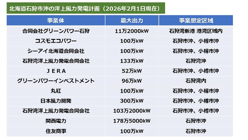 コスモエコパワーとシーアイ北海道合同会社、丸紅、住友商事はいずれも最大出力100万kWの事業を別々に計画している。このうち、シーアイ北海道合同会社は、デンマークの大手ファンド運用会社「コペンハーゲン・インフラストラクチャー・パートナーズ(CIP)」の日本法人が設立した事業会社。2020年に三菱重工業が資本参画している。このほか、旧トーメン(現 豊田通商)の元社員が設立したグリーンパワーインベストメントが96万kW、JERAが52万kWの事業計画を公表している。