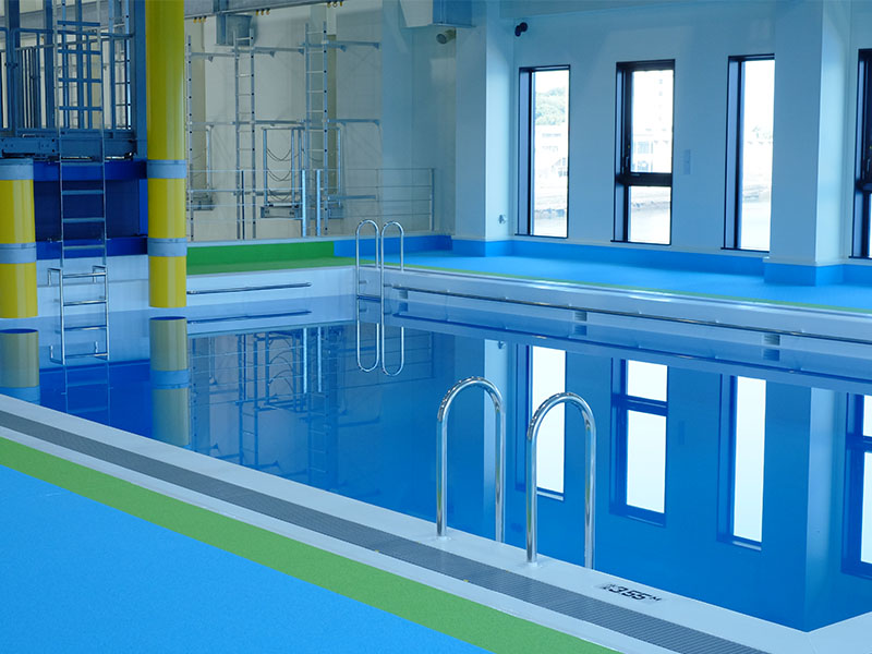 NOAトレーニングの2階には、深さ3.5mの温水プールがあり、1年を通してBSTシーサバイバルの訓練を受講できる。